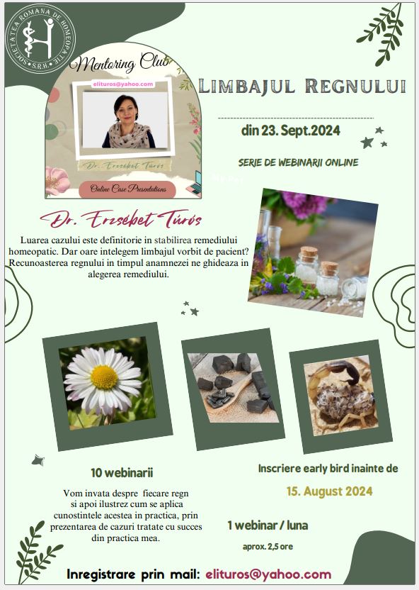 O serie de 10 webinarii in cadrul Mentoring Clubului 2024/2025 organizate in colaborare cu Societatea Romana de Homeopatie, unde invatam despre caracteristicile fiecarui regn, si despre modul in care se aplica ele in practica prin prezentarea de cazuri, tratate de mine cu succes cu remedii apartainand celor 3 regnuri. https://www.homeopatie-srh.ro/limbajul-regnului-mentoring-club-2/